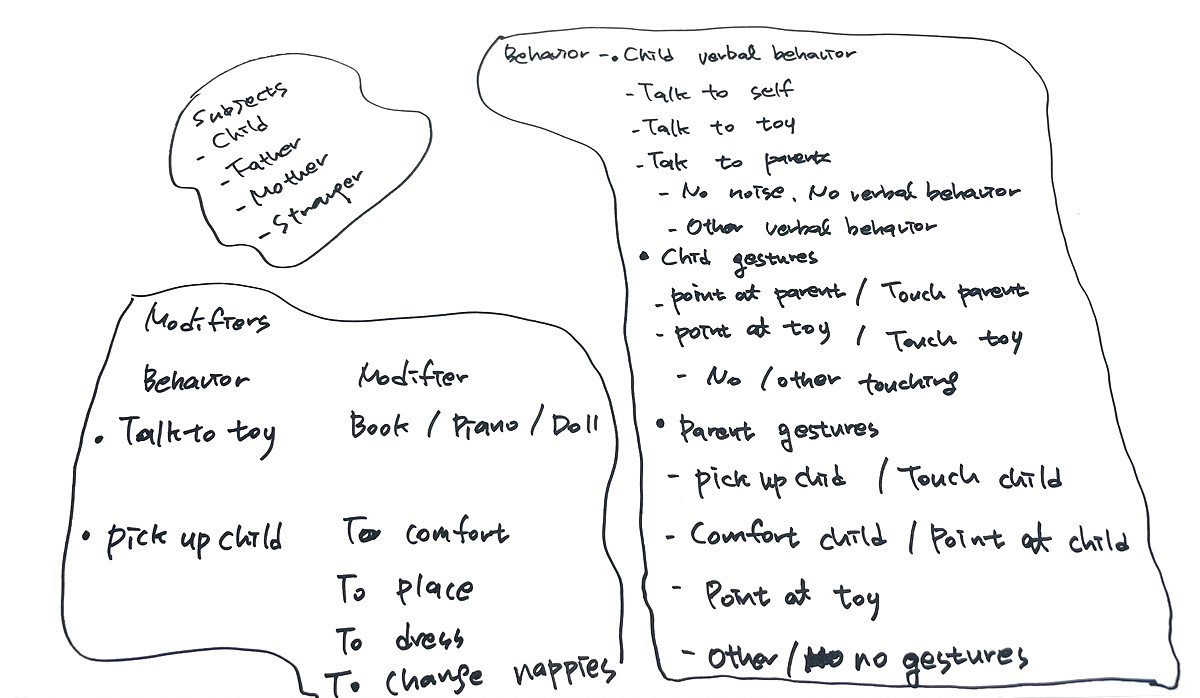 관찰 및 코딩 과정에서 관찰 대상(Subjects)은 아동, 아빠, 엄마, 낯선 사람 등으로 지정하였습니다 (상황에 따라 관찰 대상의 신원을 독립변수로 정의할 수도 있습니다.). 아동의 언어 행동은 혼자 말, 부모와의 대화, 장난감과의 대화 등으로 구분하고, 제스처는 부모나 장난감을 가리키거나 터치하는 행동으로 정의합니다. 부모의 행동 역시 아동을 안거나 위로하거나 특정 대상을 가리키는 등 다양한 형태로 정의합니다. 이때 Modifiers를 활용하면 행동의 목적이나 맥락을 조금 더구체적으로 설명할 수 있습니다. 예를 들어, 아동을 안는 행동은 단순히 안는 것으로 기록하지 않고 위로하기, 옷 입히기, 자리 옮기기, 기저귀 갈기 등의 세부적인 맥락으로 분류할 수 있습니다. 이를 통해 동일한 행동이라도 상황에 따라 의미가 어떻게 달라지는지를 보다 정밀하게 해석할 수 있게 됩니다.